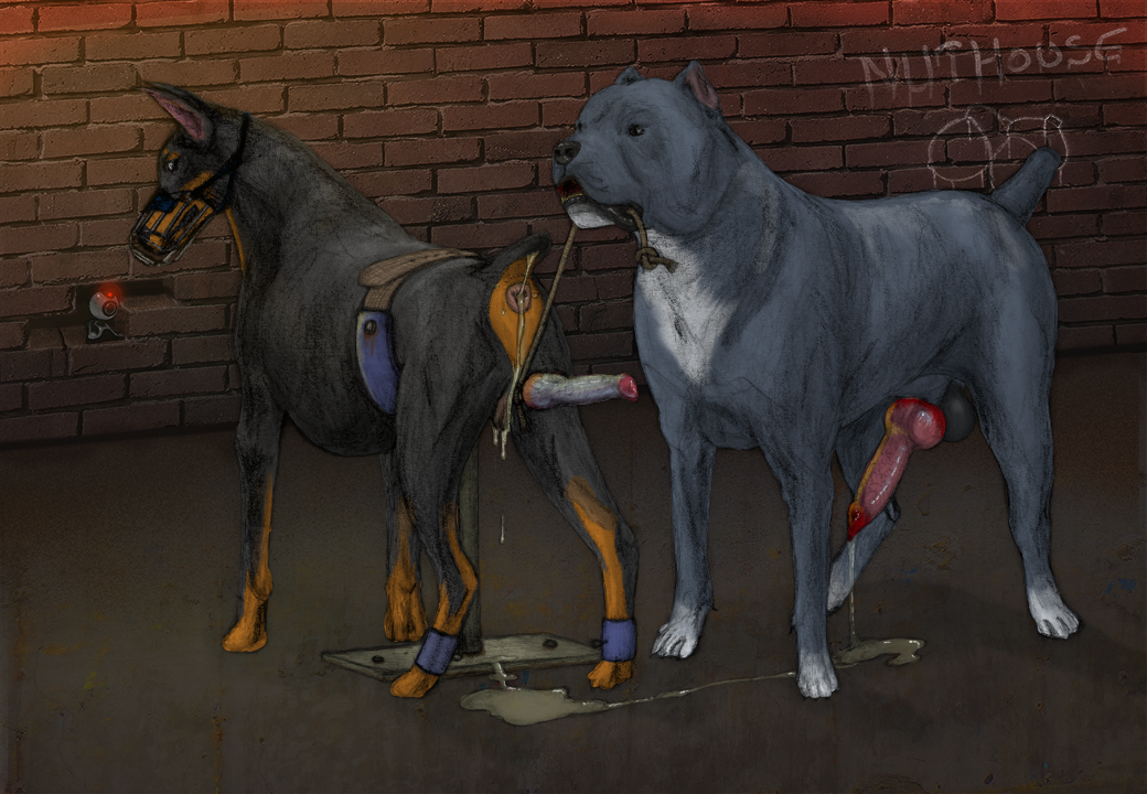 The doberman stood strapped to the breeding rack, his back legs spread and his penis pulled backward by a rope tied behind his knot. The rope was tight enough that it kept him hard, his full erection on display for the bandog and for the voyeuristic onlookers tuned in to the various webcams. The painful tie he had just experienced had gotten the bandog quite worked up. Though no longer on top of him, his smell still lingered on the doberman's coat—a musky, rank stench that permeated the air and spoke of a much rougher lifestyle than the posh existence that the doberman was used to.